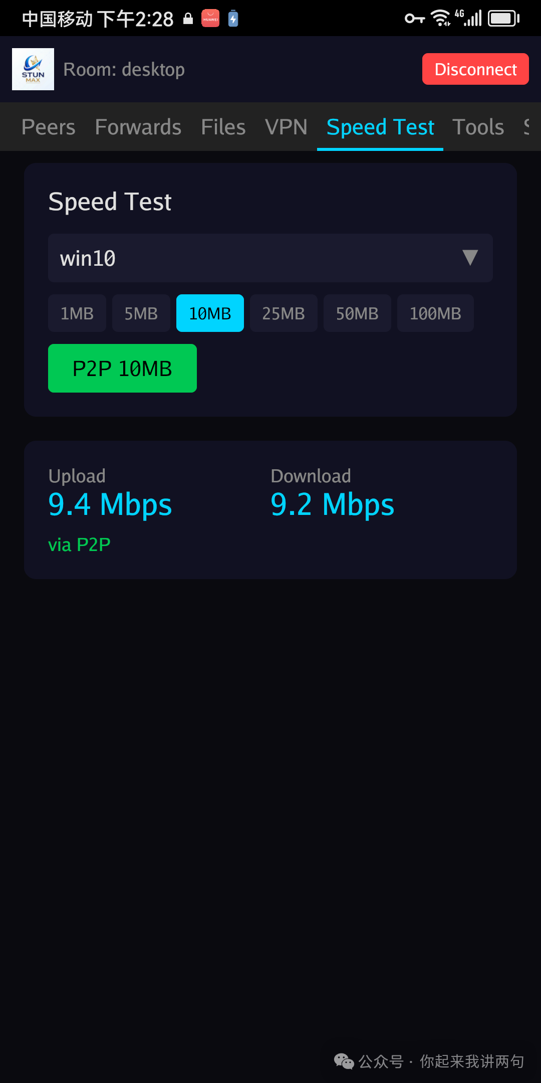 坑 4:Multidex FindClass 失败 Go 生成的 Android 库文件较大,触发了 Multidex 限制。在 Android 5.0 以下版本,必须显式启用 Multidex,否则启动时直接 ClassNotFoundException。 坑 5:APK 构建流水线 Go + Android NDK 交叉编译的工具链配置非常繁琐。最终用 GitHub Actions 搞定了自动化构建,支持 arm64 和 arm32 双架构。整个流程从代码推送到 APK 产出大约 8 分钟。 P2P 核心技术:打洞 + 加密 + 隧道 全链路加密基于 X25519 ECDH + AES-256-GCM。每次建立连接时,双方生成临时密钥对,通过 ECDH 协商出共享密钥,然后用 AES-256-GCM 加密所有隧道数据。即使中转服务器也无法解密内容。 隧道协议设计得很简单:open_tunnel → tunnel_opened → tunnel_data(base64)→ close_tunnel。所有消息都封装在 relay_data 信封里,服务器只负责转发,不解析内容。 gVisor 用户态协议栈是整个 VPN 的基础。它让我不需要系统级权限就能处理 TCP/IP 包,这在 Android 上尤其重要——因为 VpnService 只给你一个原始的 TUN fd,你得自己拆包。 真实场景:我是怎么用的 场景 1:远程访问家里的 NAS 家里的群晖 NAS 在 NAT 后面,没有公网 IP。之前用 frp 转发,但需要一台公网服务器且带宽受限。现在用 STUN Max,两台设备加入同一个房间,P2P 直连,下载速度直接拉满家里的上行带宽。 场景 2:远程开发调试 公司的开发机在内网,在外面用笔记本想访问上面跑的服务。用 STUN Max 把开发机的 8080、3000、22 端口都转发到本地,curl localhost 就能调试。 场景 3:临时文件传输 给朋友传大文件,不想经过云盘。两人打开 STUN Max,加入同一个房间,直接拖拽文件就能 P2P 传输。速度取决于两人的网络,不经过中间服务器。 性能数据