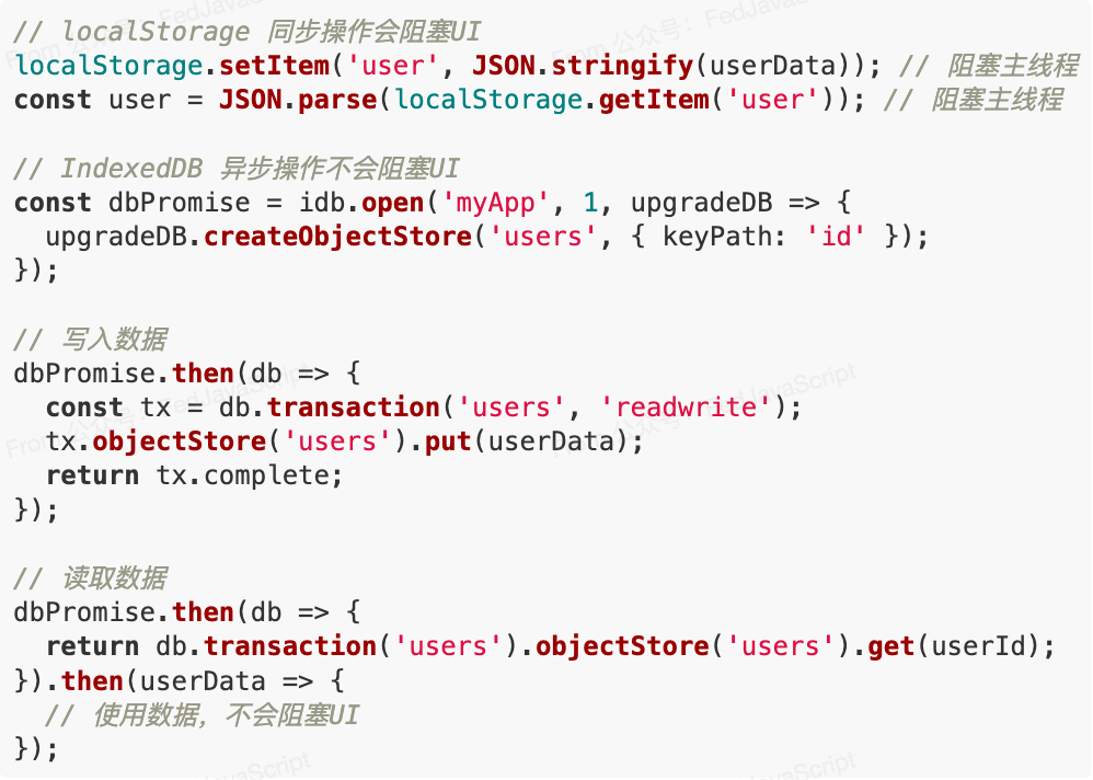 与 localStorage 的同步操作不同,IndexedDB 采用异步 API,所有操作都不会阻塞主线程: