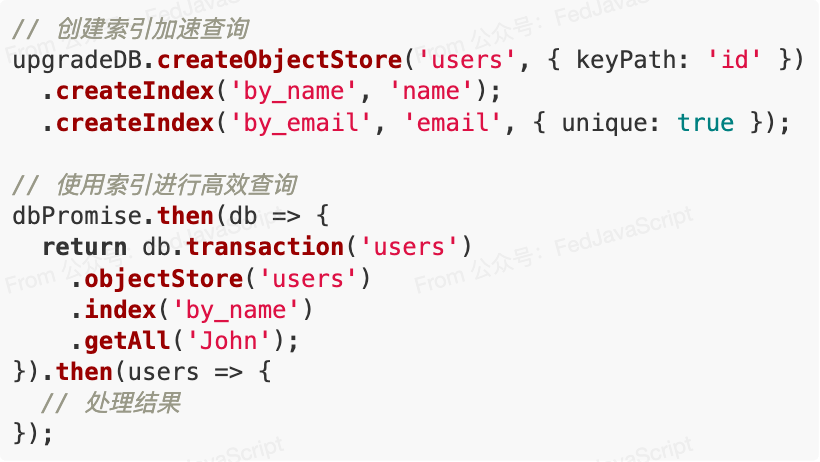 与 localStorage 的简单键值对不同,IndexedDB 提供了类似数据库的高级特性: