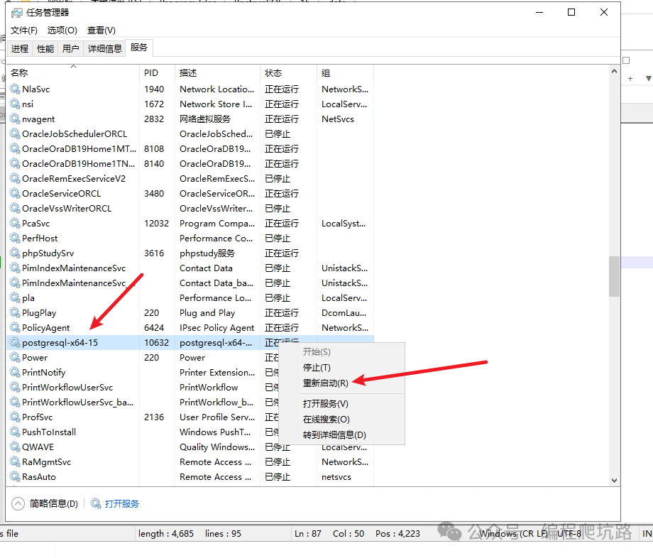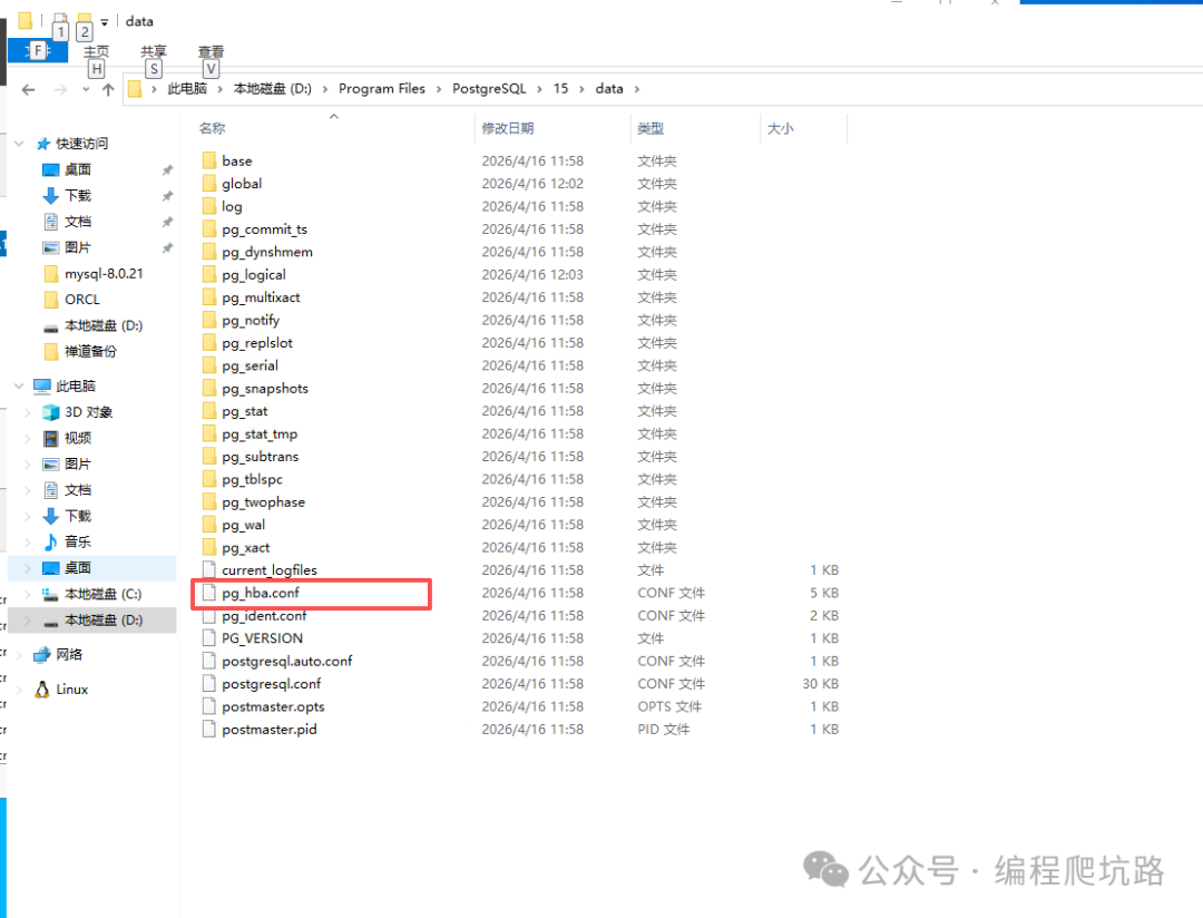 ✅ 到这里,PostgreSQL 已经安装成功! 🌐 三、开启远程连接(关键配置)默认只允许本机访问,按下面设置即可远程连接。 1. 修改配置文件找到 data 目录下的 pg_hba.conf ![]() 打开文件,找到 IPv4 配置,把地址改为: ![]() ![]() 2. 重启 PostgreSQL 服务配置修改后必须重启,才能生效。 ![]() 3. Windows 防火墙放行 5432 端口(Windows Server 必做,普通电脑建议也配置)