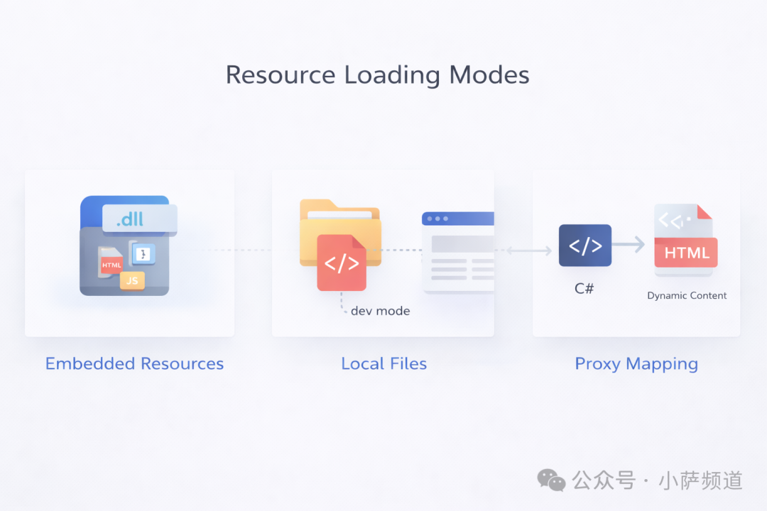 嵌入式资源:把 HTML/CSS/JS 文件作为嵌入资源编译到程序集里,发布时一个 EXE 走天下,适合正式发布。