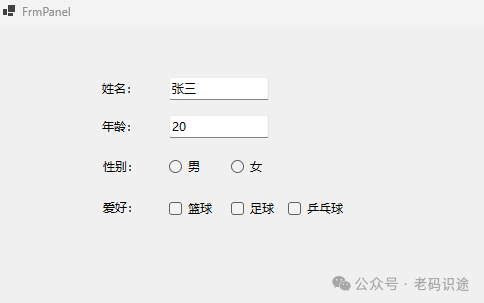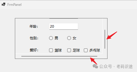 在Visual Studio中进行窗体设计时,Panel控件会有一个虚线边框,用于标识Panel控件的有效范围,如下所示: ![]() 当实际运行起来时,是不带边框的,如下所示: ![]() 如果需要设置Panel容器的边框,可以设置BorderStyle属性,默认为None,表示无边框,设置为纯线(FixedSingle),效果如下所示: ![]() 如果Panel中子控件的位置大于Panel控件的大小,默认是会自动裁切,不显示滚动条;如果需要显示滚动条,则需要设置AutoScroll属性为true,如下所示: ![]() Panel控件设置背景色,同时会将背景色应用到其所包含的子控件中(如:Label,RadioButton,CheckBox等),如下所示: ![]() 如果不想子控件和Panel容器控件背景色保持一致,则需要单独设置子个控件的背景色,如下所示: ![]() 注意:默认添加的Panel控件,是不自动填充到Form窗体中的,如果需要自动填充窗体,则需要设置Panel的Dock属性为Fill。 SplitContainerSplitContainer控件可以被视为一个组合控件,它由一个可移动条分隔成两个面板。 当鼠标指针位于条上时,指针的形状会改变,以指示该条是可移动的。此控件可以创建复杂的用户界面,如上下布局,左右布局等常见形式;SplitContainer关键属性如下所示: