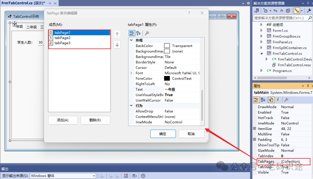 在工具箱中,拖动TabControl控件到Form窗体中,便可以创建TabControl实例。默认创建的TabControl,并不会填充到Form窗体,如果需要填充整个窗体,可以设置Dock属性为Fill。在Visual Studio设计器中,可以点击TabControl右侧的箭头添加和删除选项卡,如下所示: ![]() 除了上述方式,在选择TabControl实例后,通过属性窗口的TabPages集合编辑器窗口进行添加或删除选项卡,以及修改选项卡的属性等,如下所示: ![]() 通过TabPages选项卡编辑器,可以实现如下功能:
