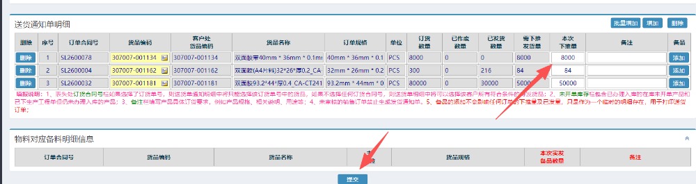 搜索需要出货的明细 可选择不同订单号的物料。选择之后如下图所示: 提交即可查询到对应的送货单;菜单为仓库管理-物料出库管理-销售出库管理-送货单明细管理:如下图所示: