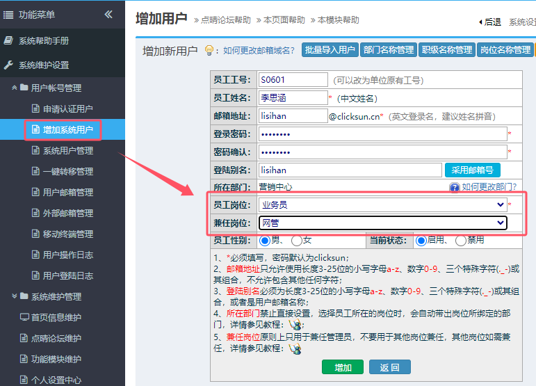 点晴永久免费OA系统中如何实现一个人兼任多个部门的不同岗位设置啊?