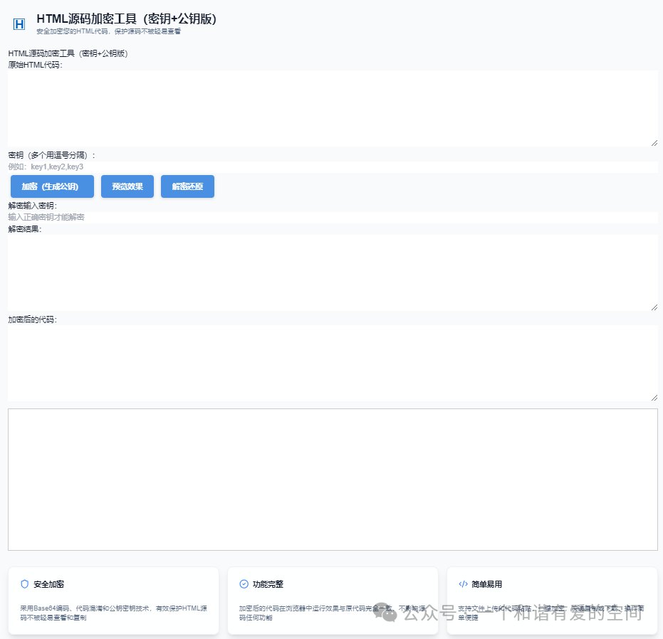 HTML源码加密工具(密钥+公钥版)安全加密您的HTML代码,保护源码不被轻易查看,当然通过一些技术也是可以看到安全加密采用Base64编码、代码混淆和公钥密钥技术,有效保护HTML源码不被轻易查看和复制功能完整加密后的代码在浏览器中运行效果与原代码完全一致,不影响源码任何功能简单易用支持文件上传和代码粘贴,一键加密,...