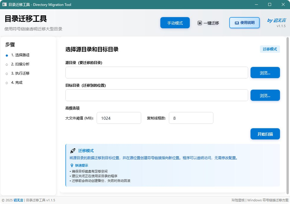 📁软件简介:一款开源的目录迁移工具,通过使用符号链接的方式,快速而安全地将大型目录迁移到其他磁盘,同时保留原有路径,使得依赖于这些路径的程序能够正常运行。解决了原磁盘空间不足的问题,提供了透明迁移的体验,无需担心文件的实际位置变...