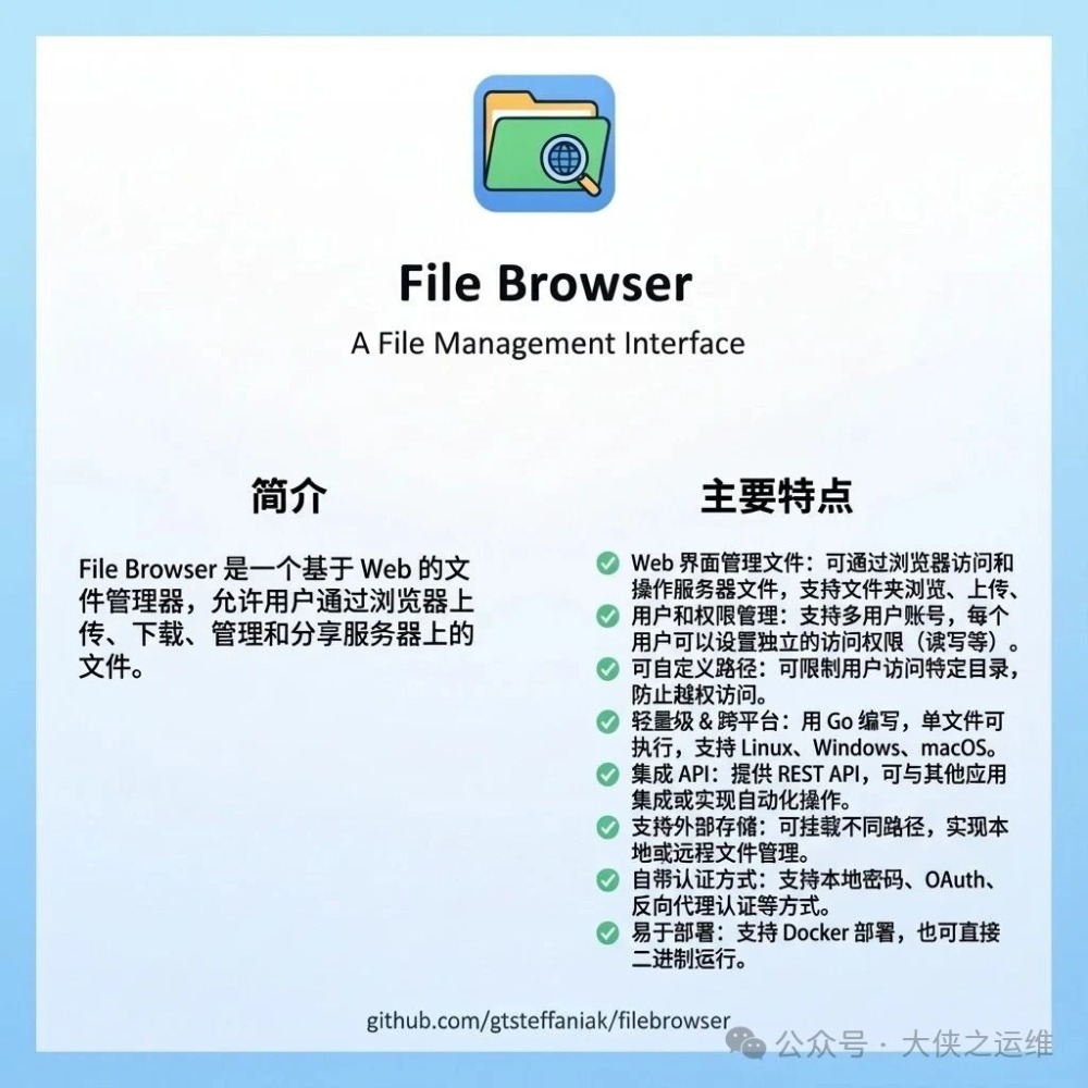 FileBrowser是一个基于Web的文件管理器,允许用户通过浏览器上传、下载、管理和分享服务器上的文件。