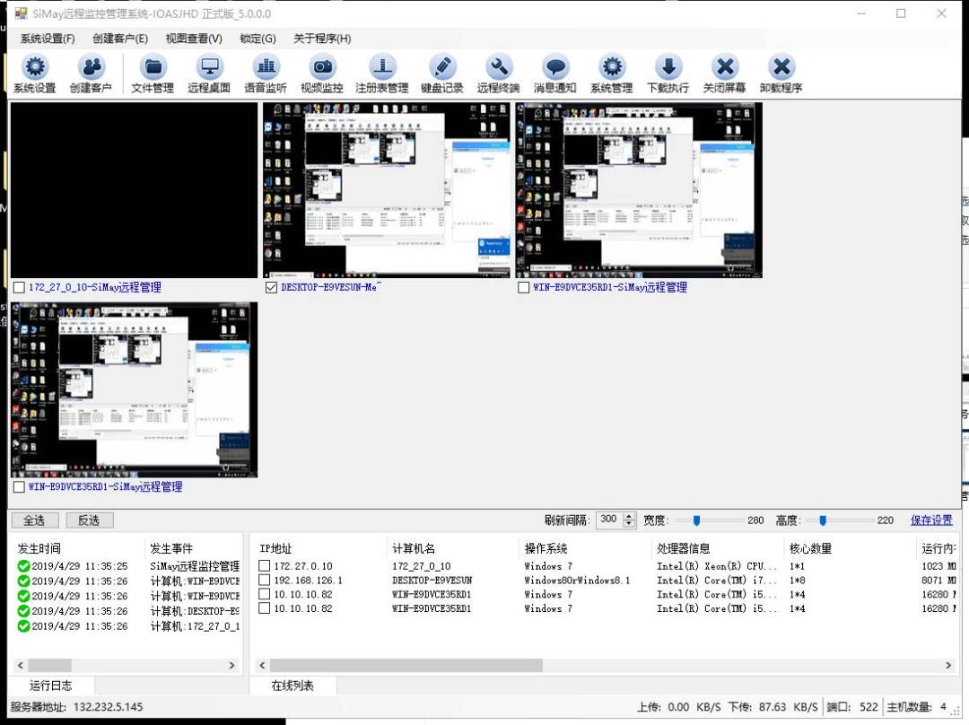 SiMayRemoteMonitorOSSiMay远程控制管理系统是一套基于Windows平台的专业级远程控制系统,底层采用IOCP异步通信模型,支持海量客户端的实时监控与高并发通信。系统集成远程桌面协助、文件管理、实时语音与摄像头、进程与注册表管理、命令行终端、桌面视图墙等功能,并可捕获UAC与WinLogon桌面。...